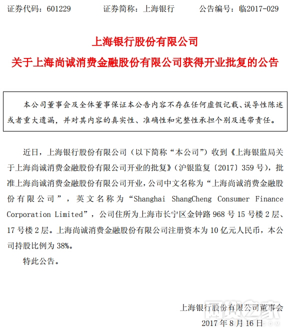 网络整理 2021-03-22 20:15网贷之家讯 8月15日晚间,A股上市公司上海银行(601229.SH)对外发布公告,称其参股的上海尚诚消费金融股份有限公司已获批开业,成为全国第22家获批开业的消费金融公司。