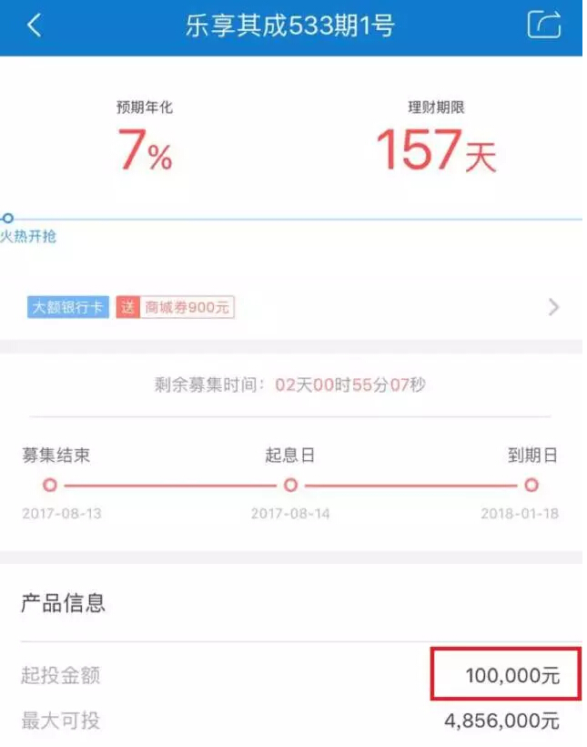 中国基金报记者发现,乐视金融旗下的乐享金融533期1号产品,收益率为7%,投资期限是157天,10万元起投。