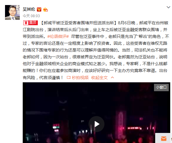 网络整理 2021-03-22 20:24今日早间8点,知名财经评论人吴其伦在微博透露,8月6日晚,郎咸平在台州椒江剧院出台,演讲结束后从后门出来,坐上车之后被泛亚金融受害群众围堵,并带到派出所。并以视频为证。