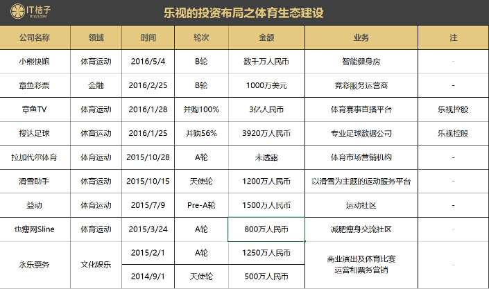 在体育生态建设方面,乐视先后投资了以商业演出活动及体育比赛项目运营和相关票务营销为主体业务的文化公司永乐票务,减肥瘦身交流社区也瘦网,运动爱好者交流平台益动,以滑雪为主题的运动服务平台滑雪助手,体育市场营销机构拉加代尔体育,专业足球数据公司搜达足球,体育赛事直播平台章鱼TV,体育赛事及彩票信息技术服务品牌章鱼彩票,以及智能健身房品牌小熊快跑等。