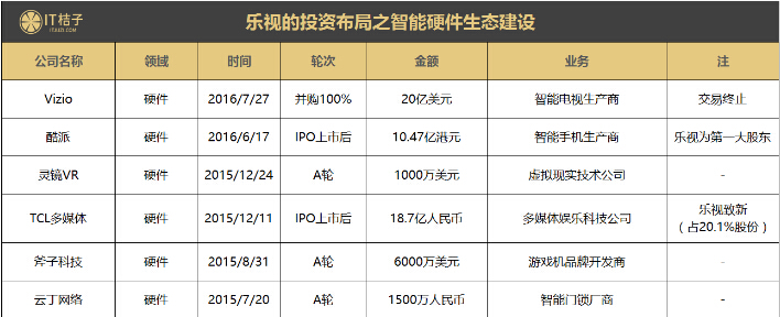 在智能硬件生态系统建设方面,乐视投资了智能门锁厂商云丁网络,从事智能硬件、消费电子产品研发设计及互动娱乐内容服务的数字科技企业斧子科技,多媒体娱乐科技公司TCL多媒体,虚拟现实技术公司灵镜VR,智能手机生产商酷派以及智能电视生产商Vizio。
