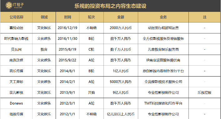 乐视在内容生态方面的其他投资还包括:TMT科技媒体和写作平台“Donews”,原创影视内容制作发行平台“芭乐传媒”,IP商业运营服务提供商“南派泛娱”,儿童教育娱乐服务商贝瓦网,全方位影视服务及增值服务公司时代影响力影视,以及动漫发行和游戏运营商喜悦动漫等。