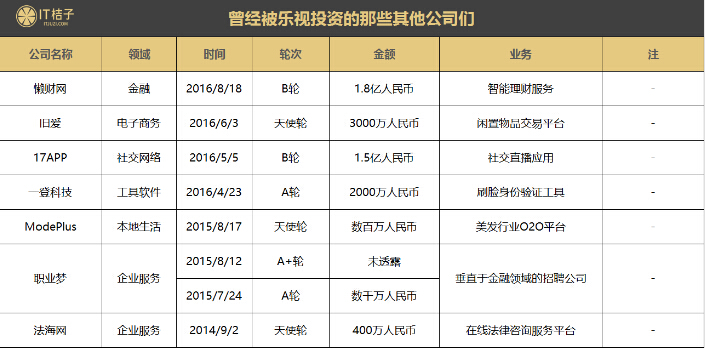 还有一些曾经被乐视投资的公司们,涉及到金融、电子商务、社交网络、工具软件、本地生活以及企业服务等各个领域。