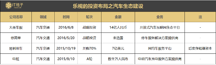 最后一块的主要投资集中在汽车生态方面,乐视投资了电动汽车充电服务方案提供商电桩,网约车服务平台易到用车,停车服务解决方案提供商停简单,开放式汽车互联网生态平台大圣车服等。