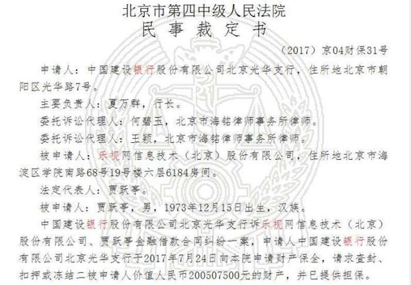 转载请标注:信息网——建行申请财产保全获批 贾跃亭及乐视2.5亿被封