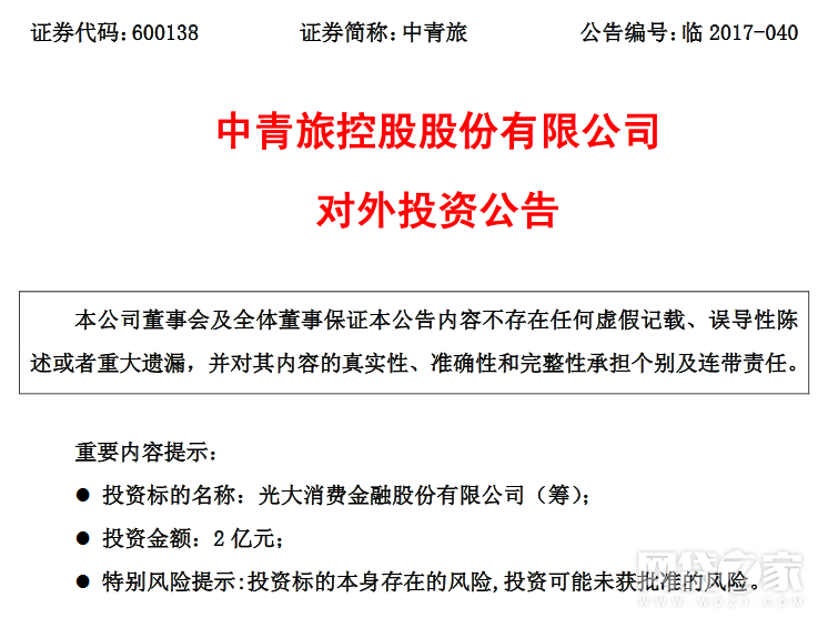 转载请标注:信息网——中青旅拟出资2亿发起设立光大消费金融公司