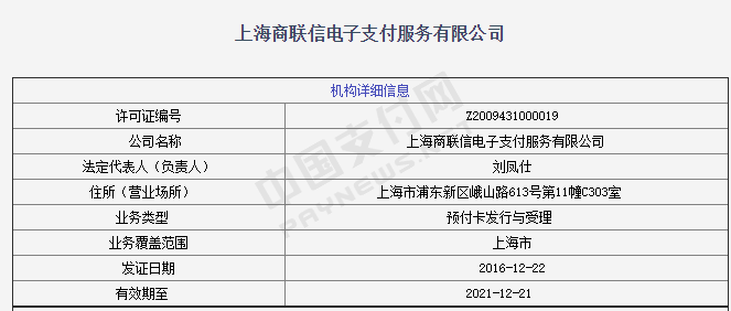 拥有上海市预付卡发行与受理业务许可的商联信于去年12月顺利通过央行第三批续展决定,有效期至2021年12月。