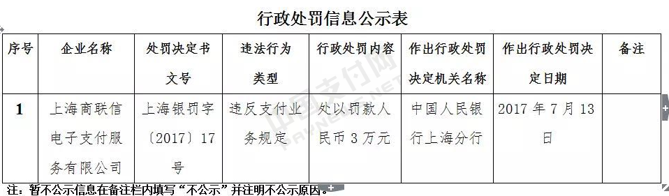 中国人民银行上海分行7月13日作出行政处罚,上海商联信电子支付服务有限公司因“违反支付业务规定”,被作出“罚款人民币3万元”的决定。