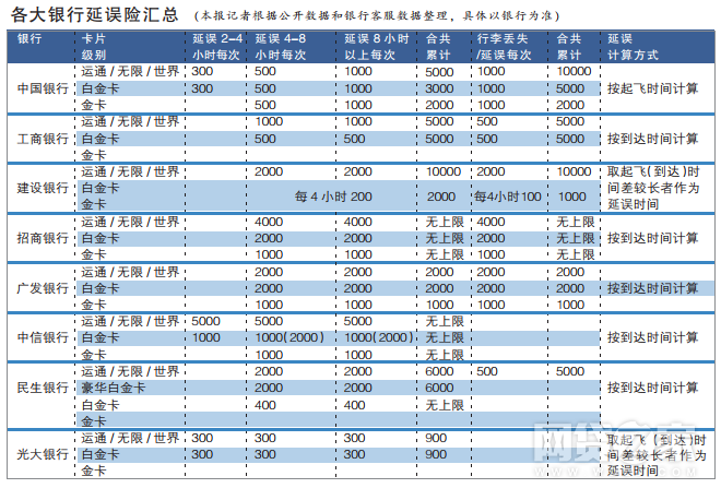 而从延误时间的长短来看,中行、中信、光大的起赔门槛较低,最低延误时间只需满2小时即可赔付;而从同等延误时间来看,中信、招行的赔付额度相比同业更高,且按单次结算,且“自然年内无赔付累计金额上限”。
