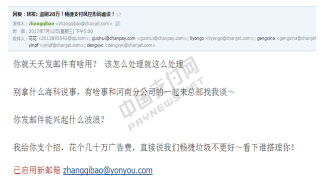 根据该代理商张贴的资料,一位姓名全拼为“zhangqibao”的畅捷支付员工对此事进行了邮件回复,态度比较强硬。