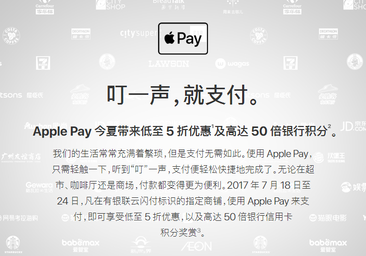 根据苹果官网说明,2017年7月18日至24日,凡在有银联云闪付标识的指定商铺,使用Apple Pay来支付,即可享受低至5折优惠,以及最高达50倍银行信用卡积分奖赏。