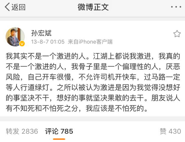 在为数不多的公开微博中,孙宏斌曾声称自己不是一个激进的人,厌恶风险,自己开车很慢,不允许司机开快车,过马路一定等人行道绿灯;之所以被认为激进是因为没想好的事坚决不干,想好的事就坚决果敢的去干。