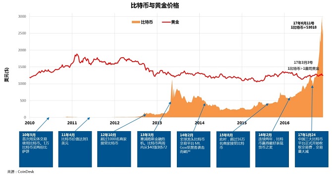 根据CoinDesk关于比特币和黄金的价值对比图可知,在短期比特币的价值会受市场消息的影响而波动,但是其长期价格似乎无规律可循,与黄金价格也几乎没有相关性。