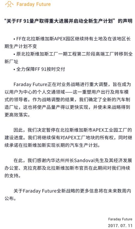 附:关于“FF91量产取得重大进展并启动全新生产计划”的声明