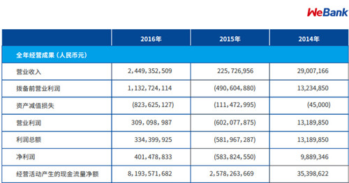 微众银行2016年净利润达4亿元,2015年净亏损5.8亿元。