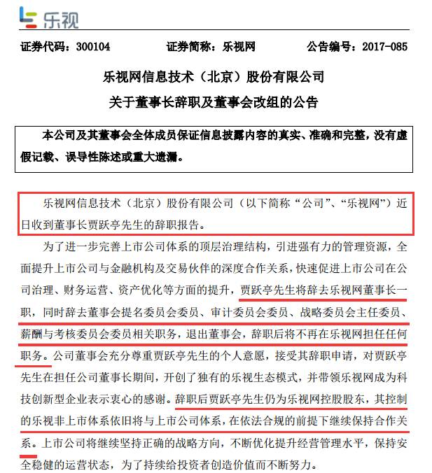 乐视网公告称,贾跃亭将辞去乐视网董事长一职,同时辞去董事会提名委员会委员、审计委员会委员、战略委员会主任委员、薪酬与考核委员会委员相关职务,退出董事会,辞职后将不再在乐视网担任任何职务。