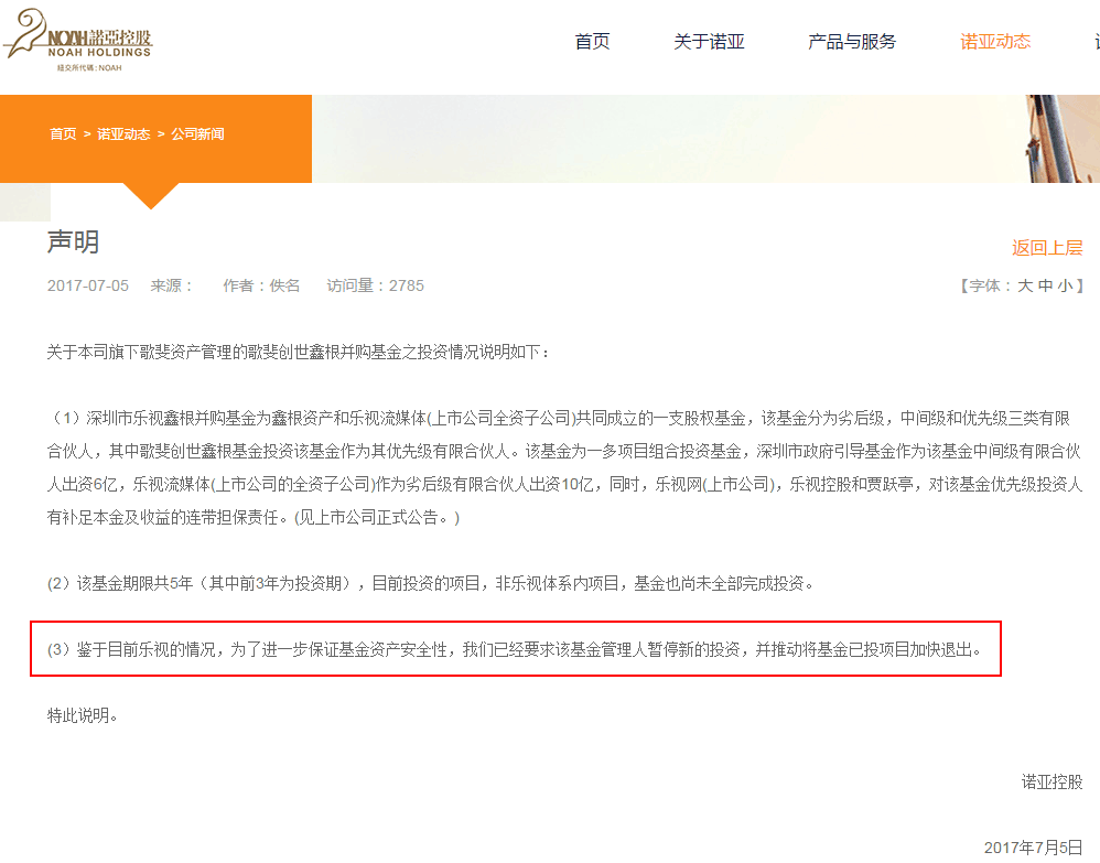 7月5日,私募基金诺亚财富旗下歌斐资产管理的歌斐创世鑫根并购基金发布声明,表示鉴于目前乐视的情况,为了进一步保证基金资产安全性,已经要求该基金管理人暂停新的投资,并推动将基金已投项目加快退出。
