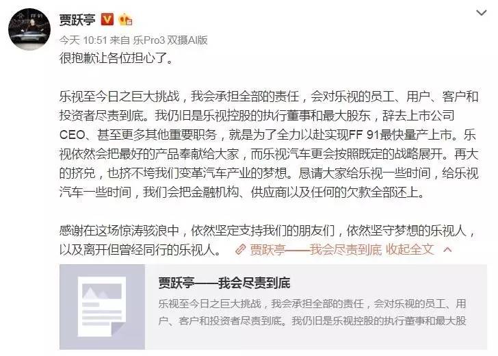 乐视至今日之巨大挑战,我会承担全部的责任,会对乐视的员工、用户、客户和投资者尽责到底。我仍旧是乐视控股的执行董事和最大股东,辞去上市公司CEO、甚至更多其他重要职务,就是为了全力以赴实现FF91最快量产上市。乐视依然会把最好的产品奉献给大家,而乐视汽车更会按照既定的战略展开。再大的挤兑,也挤不垮我们变革汽车产业的梦想。恳请大家给乐视一些时间,给乐视汽车一些时间,我们会把金融机构、供应商以及任何的欠款全部还上。
