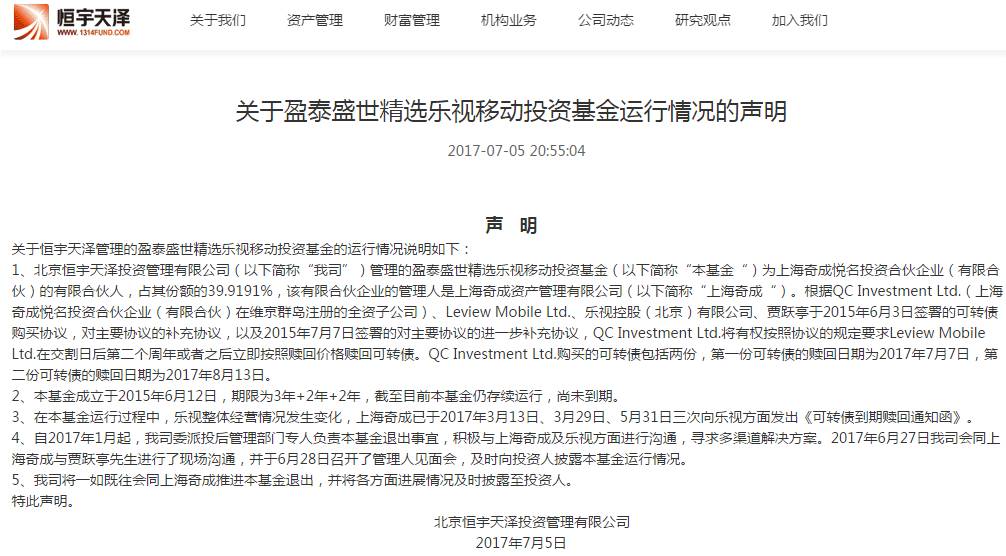 7月5日,恒宇天泽发行的盈泰盛世精选乐视移动投资基金发布声明,表示鉴于目前乐视情况,将加快退出乐视体系内项目;