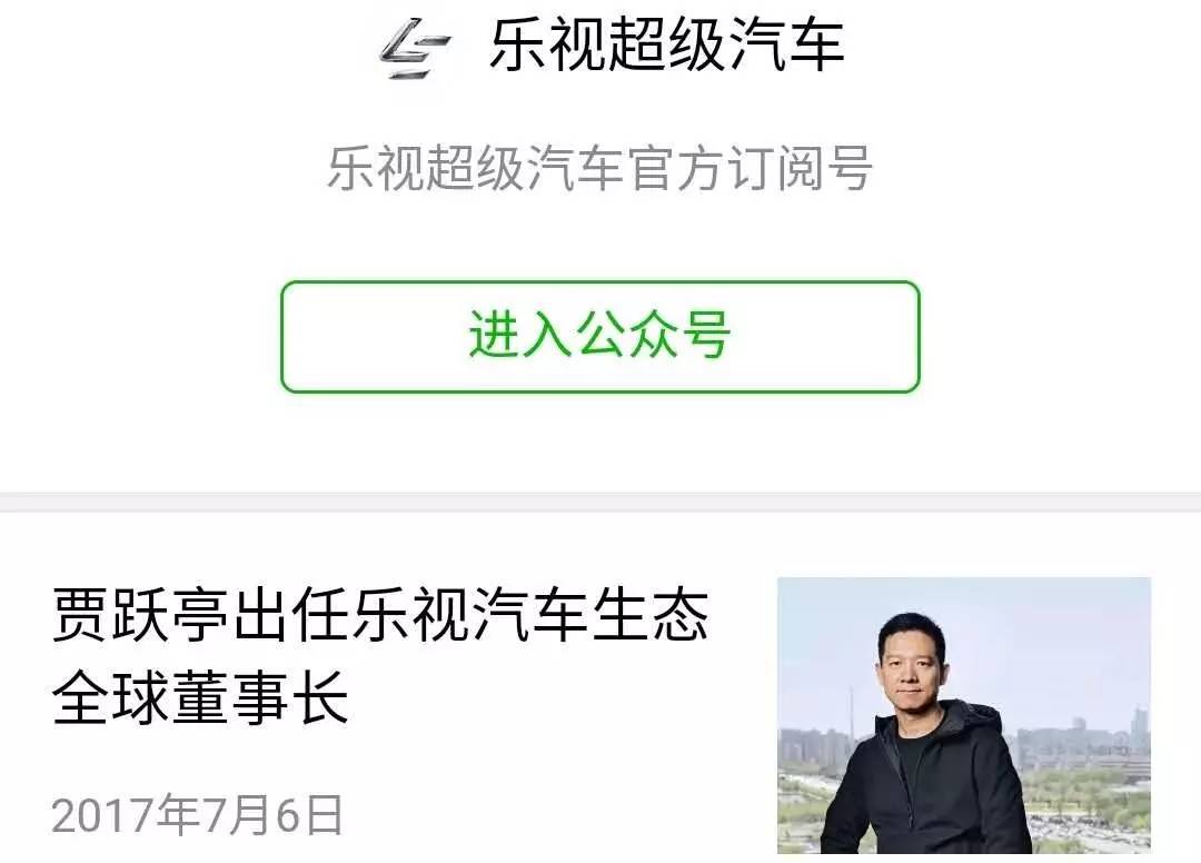几乎与乐视网发布公告的同时,乐视超级汽车官方微信公众号也发布了最新动态:贾跃亭将出任乐视汽车生态全球董事长。