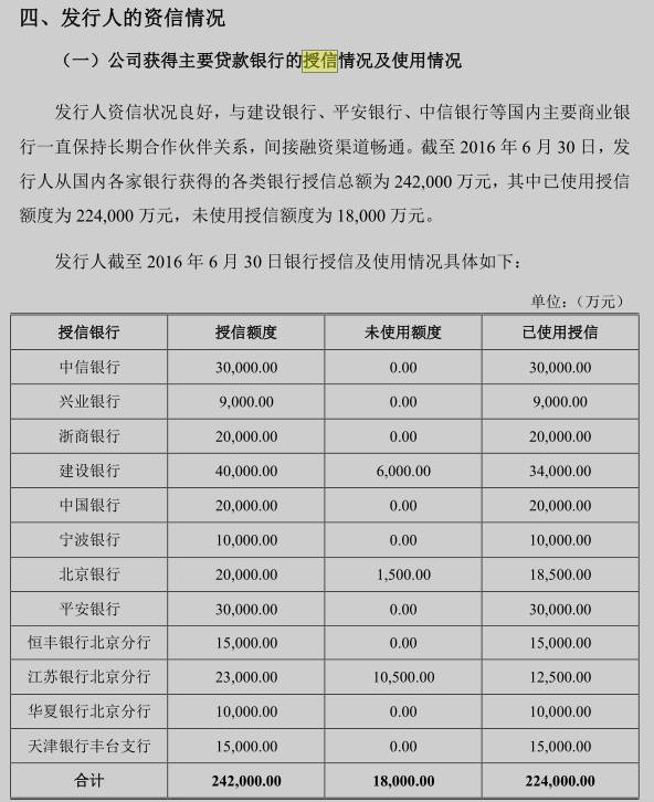 (发行人)乐视网资信状况良好,与建设银行、平安银行、中信银行等国内主要商业银行一直保持长期合作伙伴关系,间接融资渠道畅通,截至2016年上半年末,乐视网从国内各家银行获得的各类银行授信总额为24.2亿,其中已使用22.4亿元,未使用1.8亿元。表格上列举了12家银行(中信、兴业、浙商、建行、中行、宁波、北京、平安、恒丰、江苏、华夏、天津),而乐视网对这12家银行给予的授信使用率,达到92.56%。