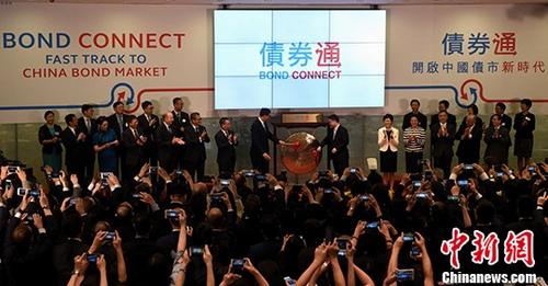 7月3日,内地与香港债券市场互联互通合作(下称“债券通”)开通仪式上午在香港交易所举行。中国人民银行副行长潘功胜与香港金管局总裁陈德霖共同为“债券通”的首笔交易鸣锣开市,标志“债券通”正式开通。