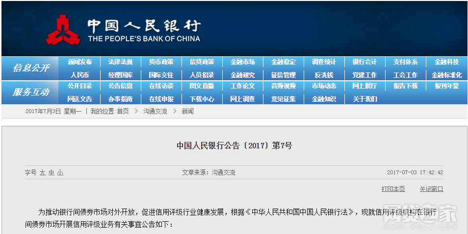 网络整理 2021-03-22 20:527月3日,中国人民银行官网发布“中国人民银行公告〔2017〕第7号”,就信用评级机构在银行间债券市场开展信用评级业务有关事宜作出规范。