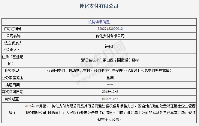 从央行公示信息来看,传化的牌照是因为处置浙江易士风险事件立功而获批的。公示信息显示,2015年12月起, 传化支付有限公司及其母公司通过债权债务承接方式,配合地方政府处置浙江易士企业管理服务有限公司风险事件,人民银行暂未公告其许可信息。目前,浙江易士公司的风险处置已基本完毕,现按规定予以公告。