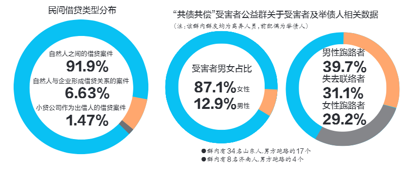 据公益群山东群组的现有案例表显示,其中据女方受害者单方陈述的统计,其前夫涉及赌博欠债和涉嫌虚假债务的数量可达17起,也占去了34名受害者中的一半,但大部分因为男方“跑路”或者举证困难,大都已放弃上诉。