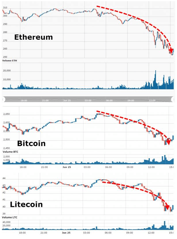 数字货币屠杀 比特币、莱特币、以太坊均大跌