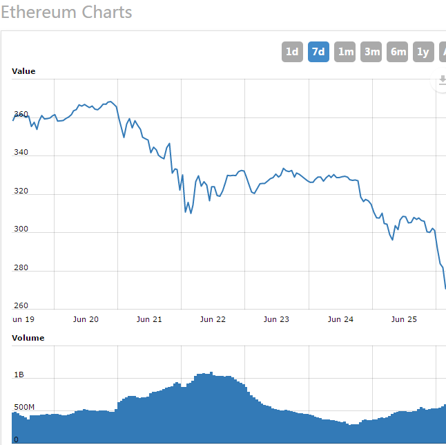 从6月20日至今,在一周的时间内,以太币价格跌去了整整100美元(即27%),目前较昨日有所回升,报270美元。