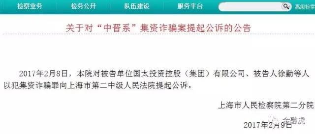 2017年2月9日,上海市人民检察院第二分院发布“关于对“中晋系”集资诈骗案提起公诉的公告”。公告称,2017年2月8日,对被告单位国太投资控股(集团)有限公司、被告人徐勤等人以犯集资诈骗罪向上海市第二中级人民法院提起公诉。