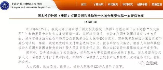 据上海第二中级人民法院官网公布的消息显示,“2017年6月22日,我院公开开庭审理了国太投资控股(集团)有限公司(以下简称“国太集团”)和徐勤等十名被告人集资诈骗一案。公诉机关指控:被告单位国太集团以非法占有为目的,使用诈骗方法向社会不特定公众募集资金达人民币400余亿元,部分集资款被国太集团及其下属公司消耗、挥霍,致使案发时未兑付本金达48亿余元。被告单位国太集团,被告人徐勤和其他被告人系国太集团直接负责的主管人员及直接责任人员,均应当以集资诈骗罪追究其刑事责任。”