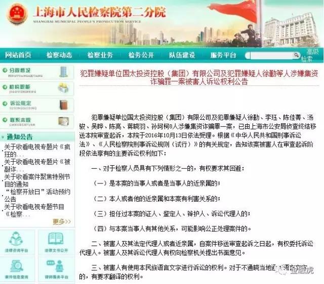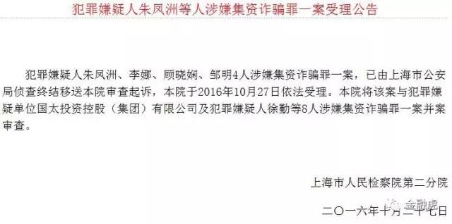 2016年10月27日,上海市人民检察院第二分院发布关于“犯罪嫌疑人朱凤洲、李娜、顾晓娴、邹明4人等人涉嫌集资诈骗罪一案受理公告”,将该案与犯罪嫌疑单位国太投资控股(集团)有限公司及犯罪嫌疑人徐勤等8人涉嫌集资诈骗罪一案并案审查。