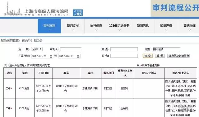 此前,根据上海市高级人民法院网发布的开庭公告显示,国太投资控股(集团)有限公司以及徐勤、朱凤洲、汤骏、陈佳菁、吴晔、陈亮、蒋晓羽、孙坷柯、顾晓娴、李娜等10人(点击此链查看10名被告人身份)涉嫌集资诈骗案原计划于6月22日和6月23日上午9:30分连续两日在上海市第二中级人民法院C101法庭开庭审理。