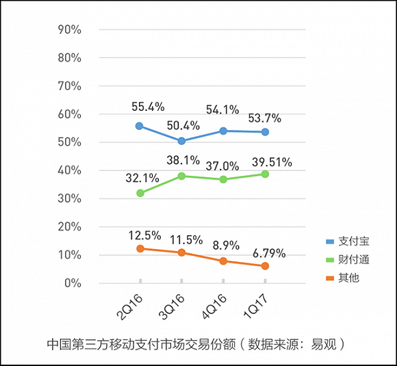 据易观智库发布的2017年第一季度《中国第三方支付移动支付市场季度监测报告》数据显示,2017年第一季度,中国第三方移动支付市场交易规模达到18.8万亿,其中支付宝占比53.7%,财付通(微信支付+QQ钱包)为39.51%,支付宝领先约14个百分点。