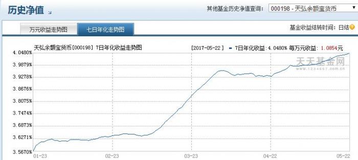 (余额宝七日年化收益率走势。5月23日为4.028%)