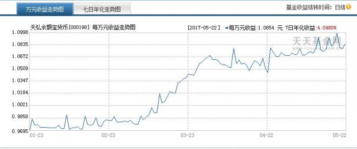 (余额宝万元收益走势,5月23日每万份收益为1.0854元。)