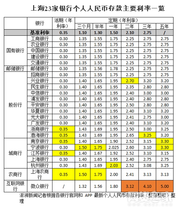 三月期存款利率最高的是宁波银行和上海农商行,利率为1.5%,比利率最低的五大行要高出0.15个百分点;半年期存款利率最高的同样是宁波银行和上海农商行,利率为1.75%,比利率最低的五大行要高出0.2个百分点;一年期存款利率最高的为杭州银行,利率为2.03%,比利率最低的五大行要高出0.28个百分点;二年期、三年期、五年期存款利率最高的都是微众银行,存款利率分别为3.12%、4.1%、5%,比利率最低的五大行分别要高出0.87个、1.35个、2.25个百分点。