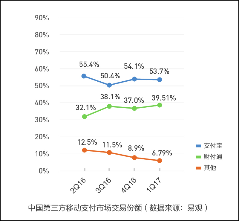 网络整理 2021-03-22 21:225月17日,易观智库发布2017年第一季度《中国第三方支付移动支付市场季度监测报告》。数据显示,2017年第一季度,中国第三方移动支付市场交易规模达到188091亿,其中支付宝占比53.7%,财付通为39.51%,支付宝领先14个百分点。