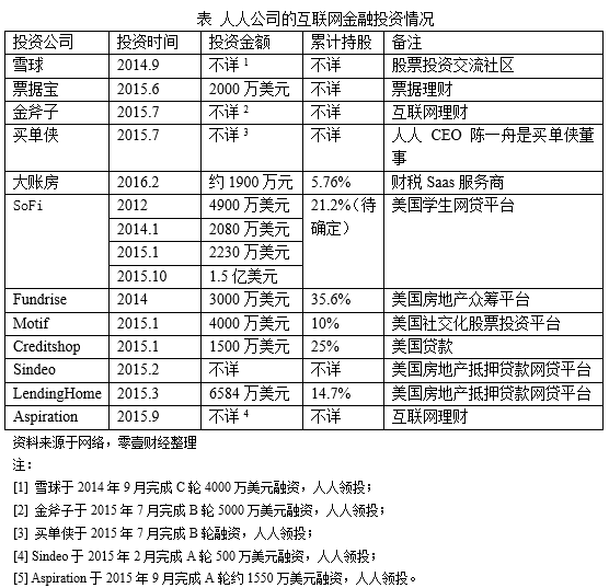 此外,陈一舟还带领人人公司进行了多笔互联网金融领域的投资: