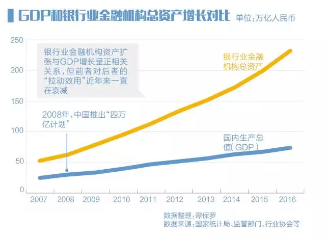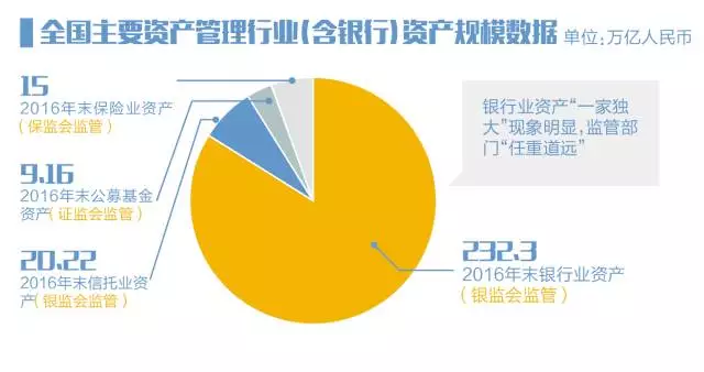 2016年年末,中国银行业的资产总规模为232.3万亿,其他三大资产管理行业保险、信托和公募基金分别为15万亿、20.22万亿和9.16万亿。换言之,银行超过后面三者总和的5倍,几乎分别等于15个保险业、11个信托业和25个公募基金业。