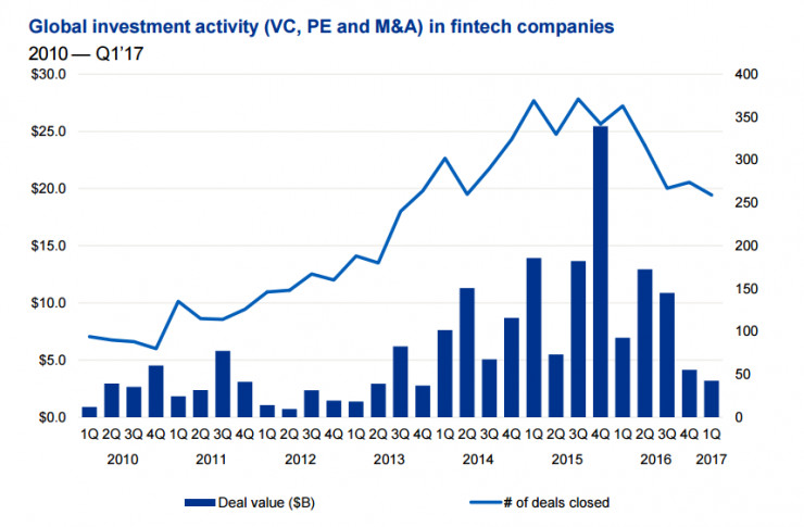 网络整理 2021-03-22 21:39近日毕马威发布了2017年第一季度Fintech报告。总体来说,在遭遇了一整年黑天鹅事件后,全球Fintech投资市场保持着相对稳定,2017第一季度投资额为32亿美元,投资活动为260桩。企业并购仍然维持着2016年第四季度以来的低迷态势,VC投资也较上季度有所下降,维持在23亿美元左右。与此同时,PE投资额和投资活动小幅增长,虽然与历史高点相去甚远。