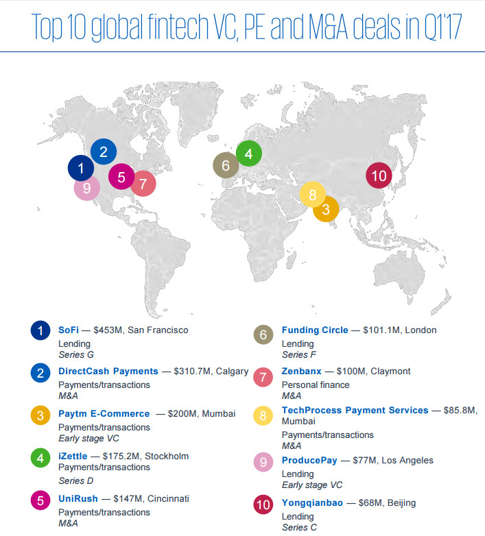尽管美国依然引领着Fintech投资,今年一季度投资额为15亿美元,占据近半全球成交额,但是Fintech中心已经遍布全球。本季度十大成交事件更是鲜明地展现了Fintech市场的多样性,美国、中国、加拿大、印度、英国、瑞典皆位列其中。就算在美国,Fintech也已在硅谷之外的地区蓬勃发展,例如特拉华州和俄亥俄州。