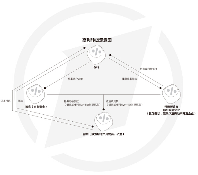 陈大海说,金融掮客们有一条隐蔽而有效的项目筛选路径:通过银行内部“资源”,掌握一批即将到期的优质银行贷款客户——按照常规,这批客户在银行借款到期时要么按时还款,要么还旧借新,往往以后者居多——银行方面的“资源”会将部分“优质”客户名单交给金融掮客,掮客们会组织资金为这些客户解燃眉之急:对需要还旧借新的客户,掮客们会提供过桥资金,按银行基准利率3-5倍甚至更高的比例收息;被银行突然停贷的客户,可以从这些掮客处获得后续的资金,需要支付的利息一般是银行基准利率的2-4倍,也有更高的。这些金融掮客实际上大多自己就是出借主体,银行内部“资源”自然也是他们的利益共同体。这是一条极为灰色的链条。