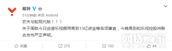 17日晚间8点40分左右,易到官方认证微博发消息称,“农夫与蛇现代版!!!关于周航今日诽谤乐视挪用易到13亿资金等各项事宜,今晚易到和乐视控股将联合发布严正声明。 ”