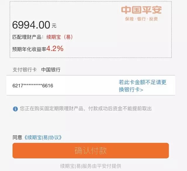 说白了就是平安福客户(不排除还有其他险种客户)提前将资金交由平安集团,平安在取得客户的授权后,帮其认购一款理财产品续期宝(易),一年后该款产品到期,本金和收益就刚好打平客户需要缴纳的保费。