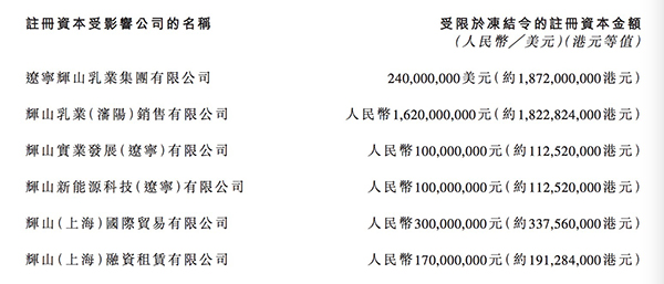 辉山乳业被冻结资产列表