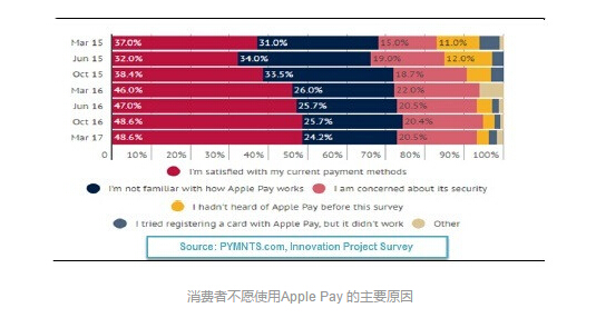 苹果公司在 2014 年 10 月推出了 Apple Pay,但是消费者对这项服务缺乏了解,同时也更习惯于其他已有的支付方式,所以 Apple Pay 的普及率和使用率似乎都不是很高。截止到 2017 年 3 月,在所有符合条件的 iPhone 用户里,只有 22% 的人尝试过 Apple Pay,相比于一年前的 23% 有所下降。而在那些还没有激活 Apple Pay 的用户中,对自己目前的支付方式感到满意的占到了 49%,不知道如何使用 Apple Pay 的占到了 24%,出于安全考虑不想使用 Apple Pay 的占到了 21%。