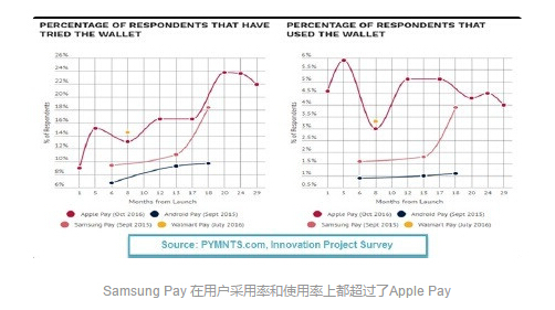 根据金融科技网站 PYMNYS.com 和知名市场调研公司 InfoScout所做的一份调研显示,如果以三月份为终点,那么在过去的五个月时间里,Samsung Pay 虽然交易占比也不是很高,但是在用户采用率和使用率这两个指标上均有大幅提升。与 Apple Pay 和 Android Pay不同,Samsung Pay 选择了直接和大多数美国零售支付终端合作。根据之前苹果发布的数据显示,Apple Pay 在美国支持、受理 300 万个商户终端,在全球范围内为 1100 万商户终端。但这也意味着有大约 700 万个美国商户终端还不支持 Apple Pay。